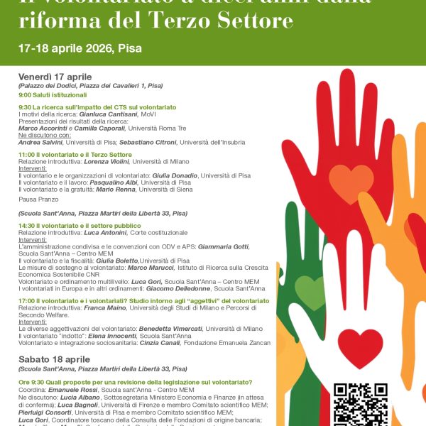 Appuntamento a PISA il 17-18 aprile 2026 per il convegno “Il volontariato a dieci anni dalla riforma del Terzo Settore” organizzato dall’Università Sant’Anna di Pisa, nell’ambito di un progetto che vede il MoVI come partner per riflettere sull’impatto della riforma del terzo settore sul mondo del volontariato a 10 anni dalla promulgazione della nuova normativa.